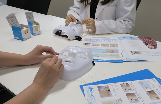 貼り方説明会では、クリアホールドの特長をご紹介するほか、患者さんのお顔を模した「お面」を使って、実際にクリアホールドを上手に貼るための練習時間も設けています。