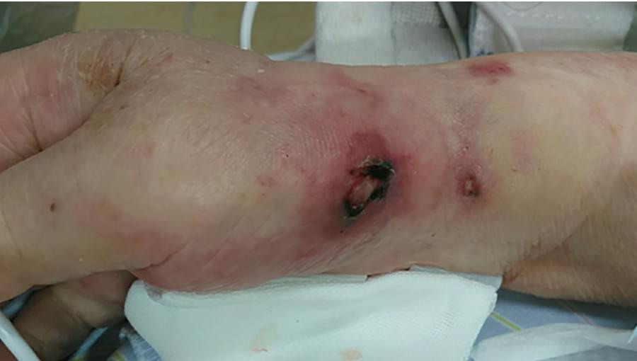 Aライン挿入後、刺入部からの出血が止まらず、緊急性も高いため止血目的固定バンドのようなもので圧迫されていた。さらに、上から抑制帯により圧迫され…。