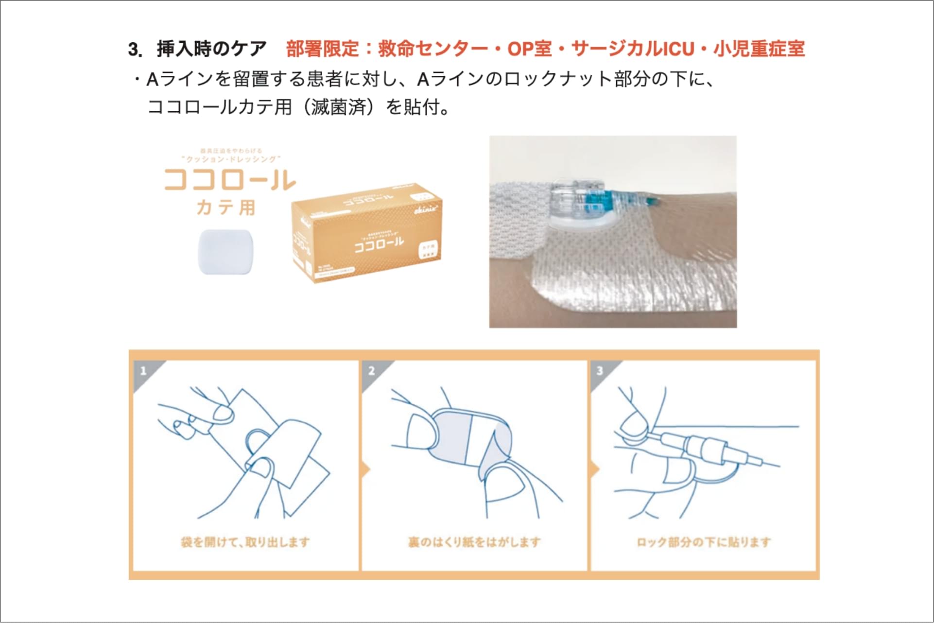 その後、当院の褥瘡対策マニュアルのMDRPU項目にAラインに関する内容を追加。Aラインを留置する患者に対して予防対策を徹底しています。2024年4月からは救命センター以外にも使用部署を拡大させ、OP室(心外手術、小児手術)、サージカルICU、小児重症室でも「ココロール カテ用」を使用した対策を開始しています。(2025年2月現在、Aライン接続部でのMDRPU発生はゼロ件を継続中)現在、NICU(新生児集中治療室)での使用も検討しています。